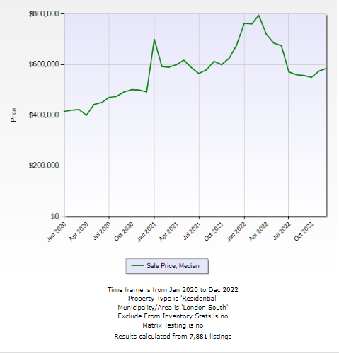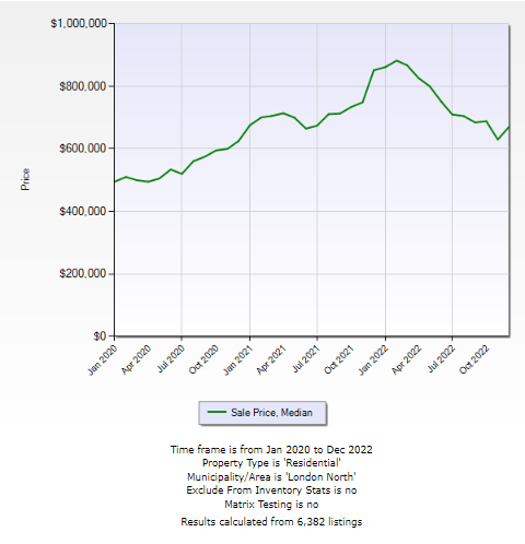 The highest median average price for a home sold in 2022, in London North, occurred in March reaching $867,500. The downward trend, driven by the rise in the bank interest rate increases, began in April and median selling prices finished the year, in December, at $670,000 based on a very low sales volume of 36 homes.
