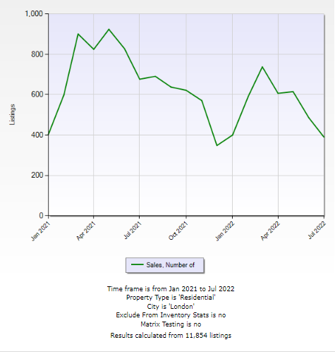 The average price of a Home in the city of London fell to $659,976. This was the second time this year that the average price fell below $741,557. In month of June, we averaged $690,753. The average price in July last year in a bidding war environment was $622,128.