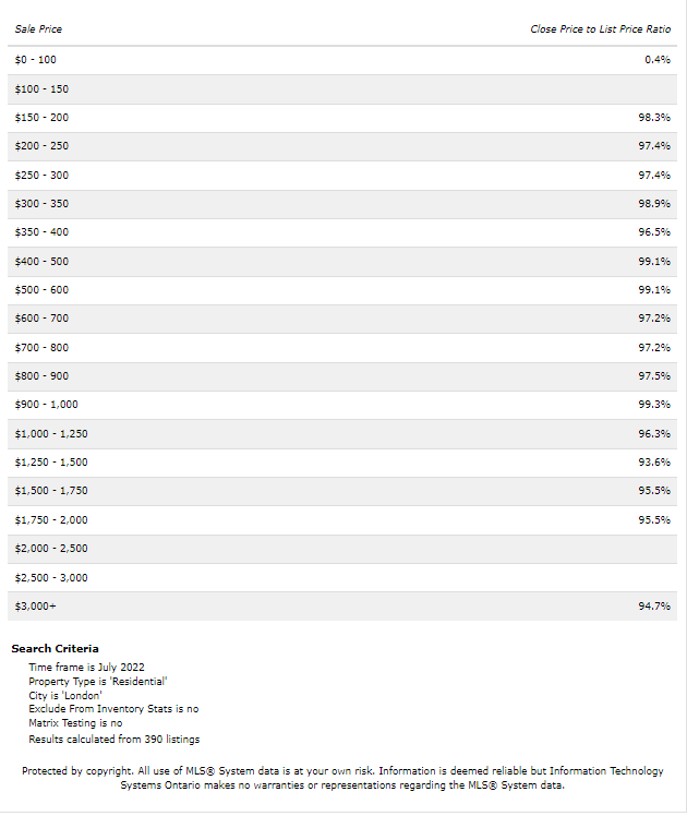 It had now jumped to 20 days to sell the average home. This is a significant slowdown from even the previous 3 slower months, April 10 days, May 11 days, and June 16 days. This slowdown in market activity moved the city of London into a false balanced market, with limited sales and supply. Negotiations are now common without bidding wars occurring. The average home is now selling at 97.8% of asking price. This will not last forever and even in June, price wars were occurring but to a lesser degree.